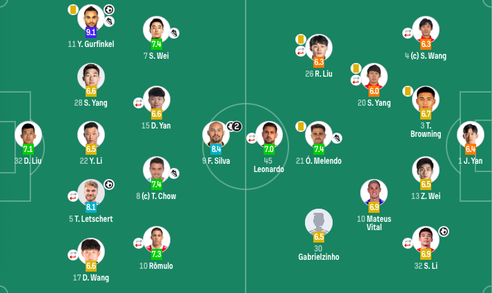 中场:21-梅伦多(F)、10-马特乌斯-维塔尔(F)、20-杨世元(71'5-张琳芃)、26-刘若钒(71'36-阿布拉汗)